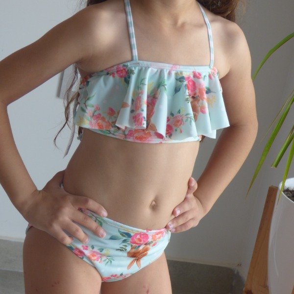 ♥ Banda con volado grande y espalda cruzada con tiritas para atar que se regulan a cada cuerpo + vedetina clásica.
